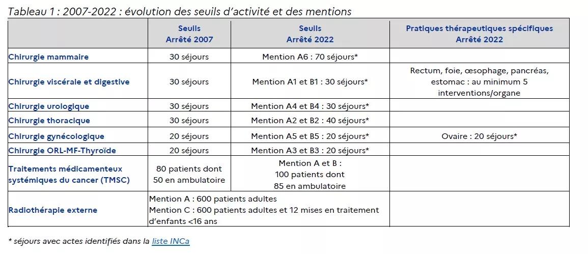Les décrets renforcent les exigences en matière de seuil d’activité en chirurgie oncologique considérant qu’une activité régulière est une garantie de qualité des soins (voir tableau 1). D’une part la méthode de calcul des seuils pour la chirurgie oncologique a été modifiée. Elle est désormais recentrée sur la chirurgie d’exérèse ce qui signifie que certains actes ne sont plus pris en compte (par exemple, pour les ablations de la tumeur, les reprises chirurgicales ne sont plus comptabilisées), et le seuil est à atteindre annuellement (contre une prise en compte des 3 dernières années précédemment). D’autre part, certains seuils existants ont été augmentés. Enfin, de nouveaux seuils ont été créés sur des segments d’activité, notamment pour :- La chirurgie oncologique mammaire (passage d’un seuil de 30 séjours à 70 séjours par an impliquant des actes identifiés dans la liste INCa)