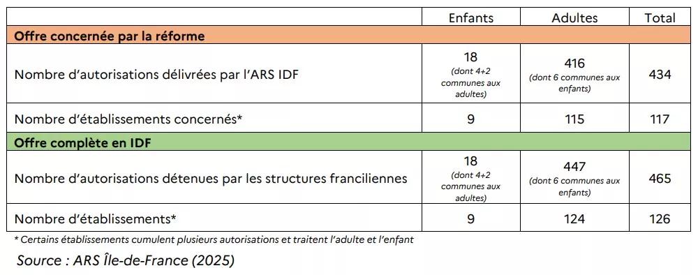 Note de lecture : le total du nombre d’établissements indiqué dans la dernière colonne du tableau n’est pas égal à la somme des colonnes « adultes » et « enfants » car certains établissements ont reçu des autorisations sur ces deux champs. La ligne « offre complète en IDF » intègre l’offre en centres de radiothérapie externe et curiethérapie adulte qui n’a pas été concernée par la réforme des autorisations (9 structures).