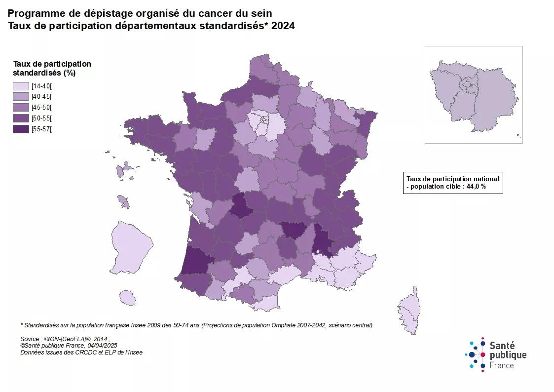 Selon Santé Publique France, Environ 2 620 500 femmes ont réalisé une mammographie de dépistage organisé en 2023, soit un taux national de participation de 48,2% (versus 44,8% en 2022). Une hausse de la participation est donc observée en 2023 mais la participation sur la période des deux années glissantes 2022-2023 demeure inférieure à celle de 2021-2022.