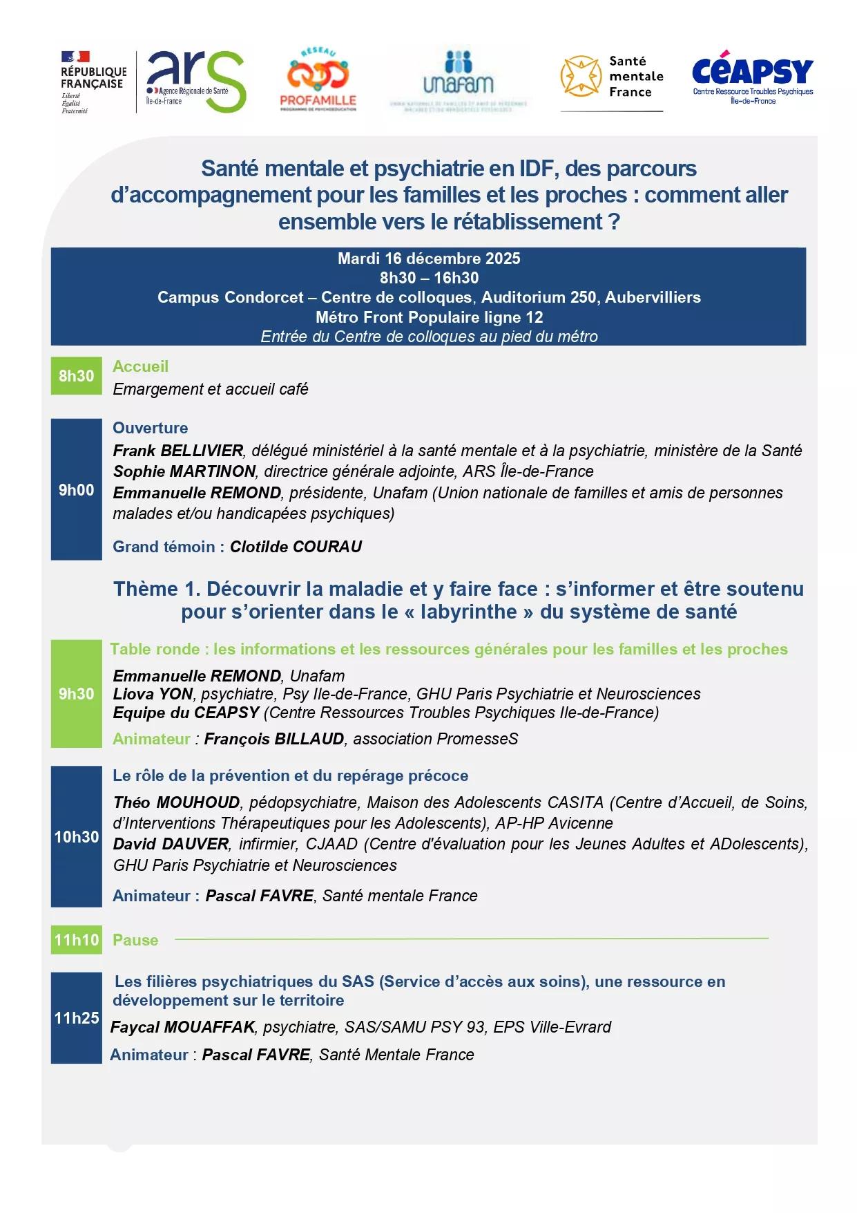 Cette journée d’échanges et de partage, à destination de tous (professionnels ; familles ; personnes concernées), avait pour objectif de présenter des ressources existantes pour les familles, à chaque étape du parcours de soins et d’accompagnement de leur proche. Elle s'est déroulée le mardi 16 décembre 2025, de 8h30 à 17h, au Centre des Colloques, Campus Condorcet, Aubervilliers.