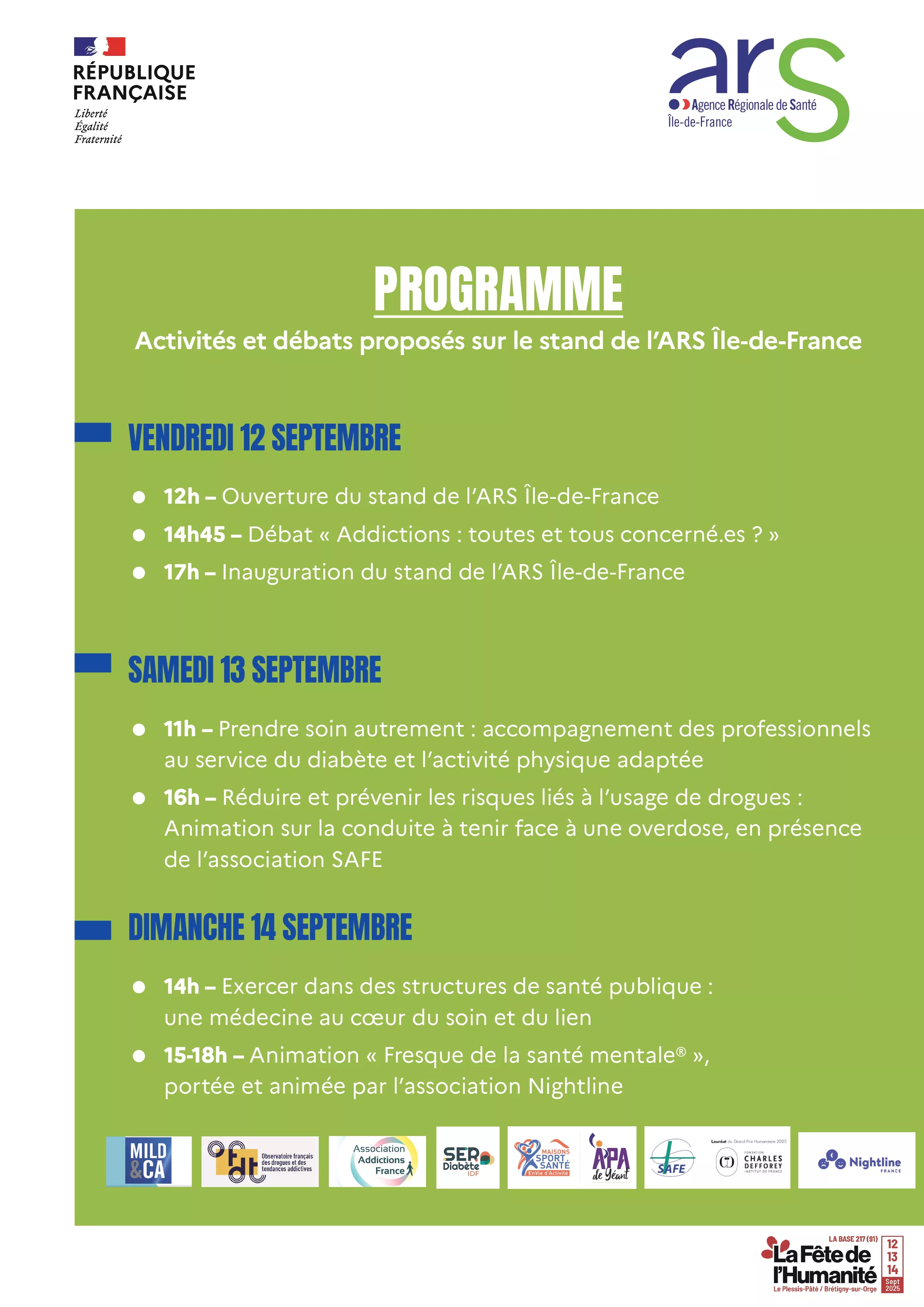 Dans l’objectif d’aller régulièrement à la rencontre des Franciliennes et des Franciliens pour faire connaître ses actions, l’Agence participe la Fête de l’Humanité du 12 au 14 septembre. Elle y tient un stand à l’espace prévention aux côtés de nombreuses associations et d'agences publiques telles que SER Diabète IDF, APA de Géant, SAFE, Nightline...