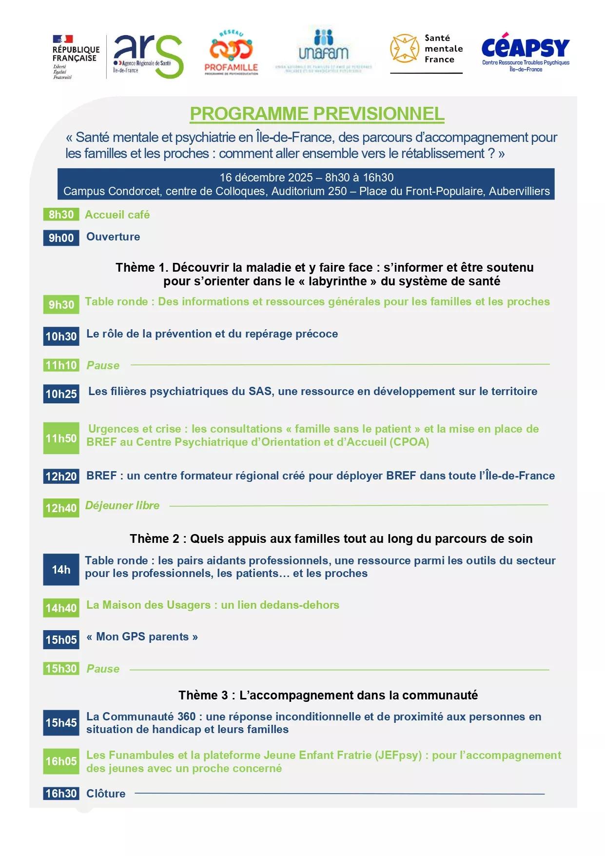 Cette journée d’échanges et de partage, à destination de tous (professionnels ; familles ; personnes concernées), a pour objectif de présenter des ressources existantes pour les familles, à chaque étape du parcours de soins et d’accompagnement de leur proche. Elle se déroulera le mardi 16 décembre 2025, de 8h30 à 17h, au Centre des Colloques, Campus Condorcet, Aubervilliers.